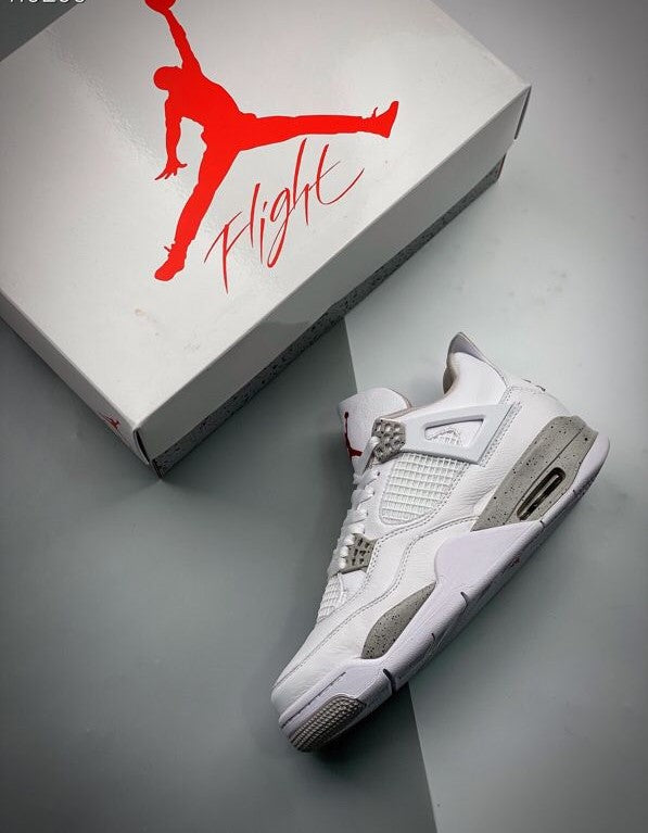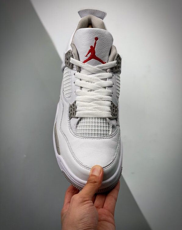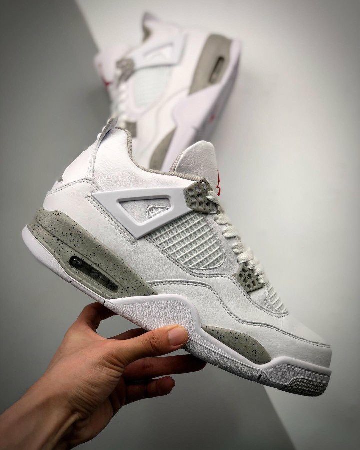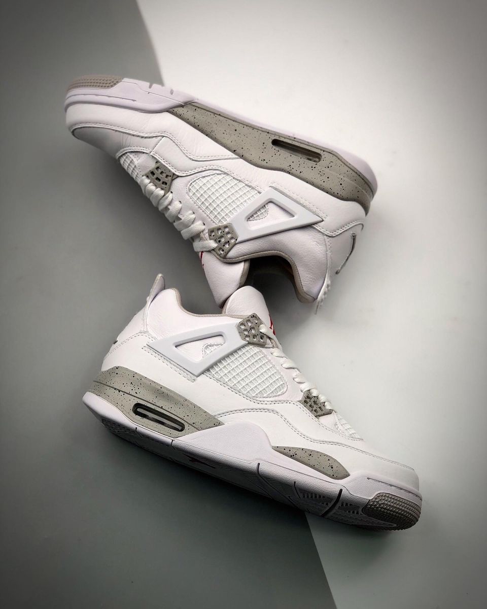 The Air Jordan 4 Retro White Oreo features a white leather and mesh upper with hits of Tech Grey on its eyelets and midsole. From there, a red Jumpman logo is embroidered on the tongue, adding a pop of color to the neutral-toned design.